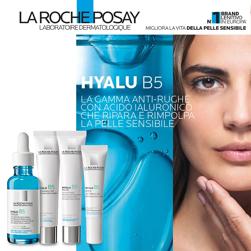 HYALU B5 SURACTIVE – linea di trattamenti specifici con acido ialuronico multi-fase e vitamina B5 (acido pantotenico) per reidratare la pelle in profondità, rimpolpare e ammorbidire, riparare la barriera cutanea, ridurre le rughe sottili e i segni di stanchezza, migliorare il tono cutaneo e la luminosità.