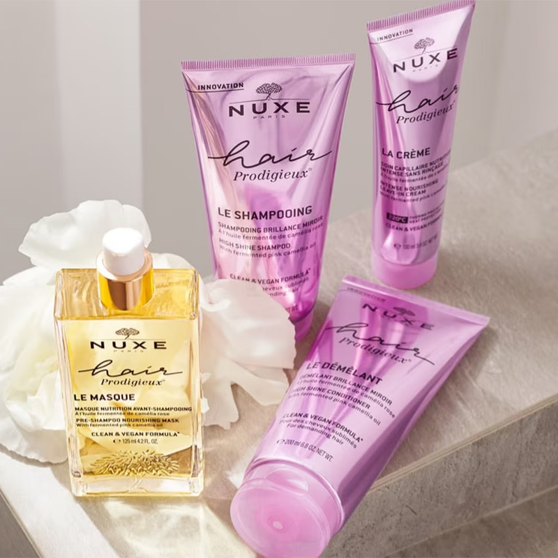 La gamma Hair Prodigieux è dedicata alla routine capelli, con 4 prodotti – shampoo, balsamo, maschera nutrizionale pre-shampoo e crema-olio districante – per ammorbidire, nutrire, illuminare e profumare tutti i tipi di capelli dalle lunghe chiome lisce a quelle ricche e ricce; ogni trattamento nutre i capelli con l’olio fermentato di Rosa Camelia e li profuma con note di Fiori d’Arancio, Magnolia e Vaniglia per una nota sensoriale unica.